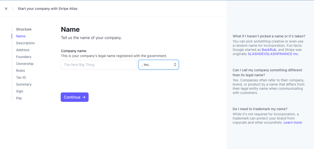 Existing Stripe users can initiate starting a company with Atlas using their start flow. In the flow you're asked to provide the information Stripe requires to lodge your application with the relevant government bodies. They also ask you to sign the details and pay the fees, all in the same flow.
